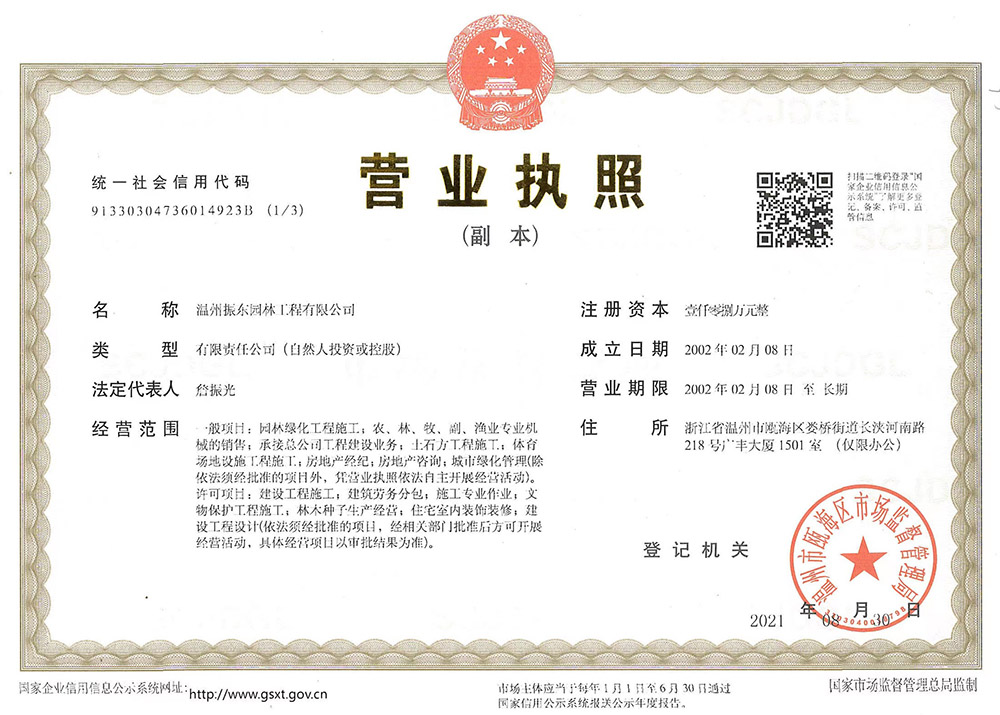 溫州振東園林工程有限公司成立于2002年2月,前身是溫州振東園林養(yǎng)護(hù)工程有限公司成立。在公司領(lǐng)導(dǎo)的帶領(lǐng)下,已經(jīng)發(fā)展為現(xiàn)具有固定資產(chǎn)800多萬(wàn)元,年?duì)I業(yè)額近3000萬(wàn)元,年利潤(rùn)15%以上的企業(yè),振東現(xiàn)有職工66人,管理人員15人。公司以“竭誠(chéng)高效,業(yè)主至上,開(kāi)拓進(jìn)取,美化環(huán)境”為宗旨為廣大客戶提供服務(wù)。